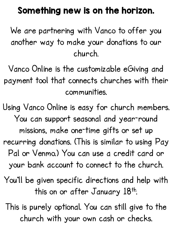 Your checkor cashofferings can still be dropped in the basket in the sanctuary, or checks can be mailed in to the church office. They will be collected, counted, and deposited each week.